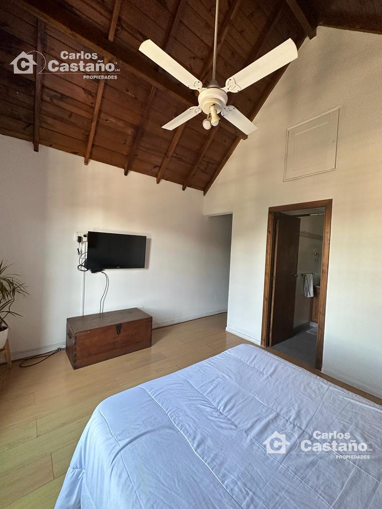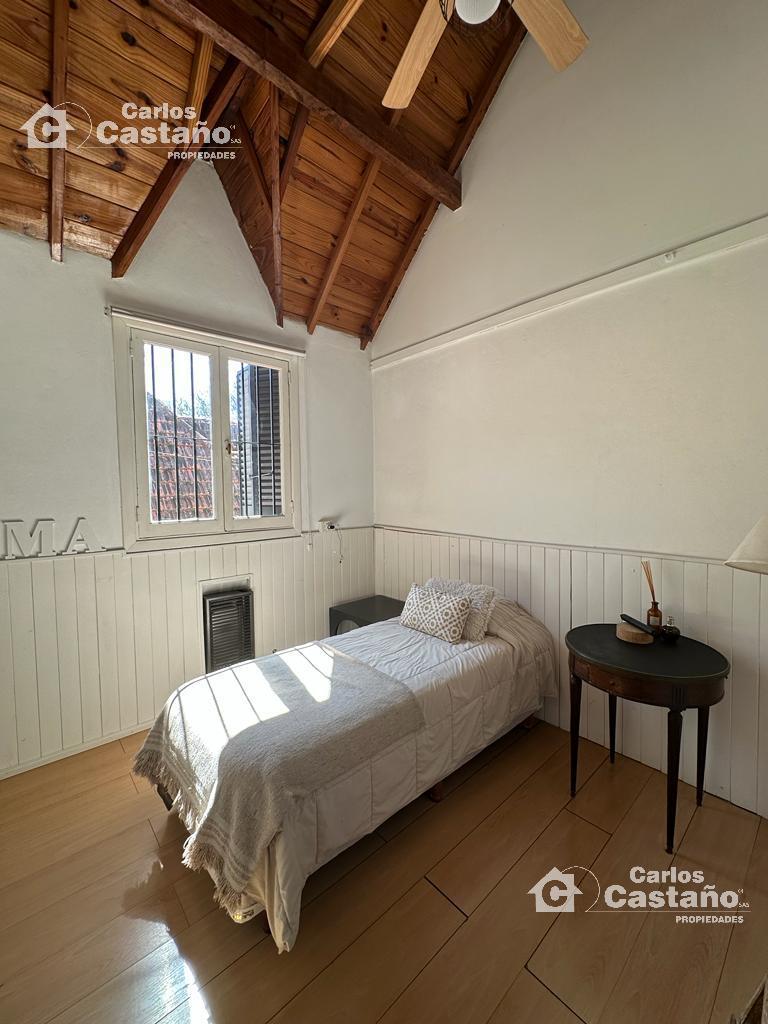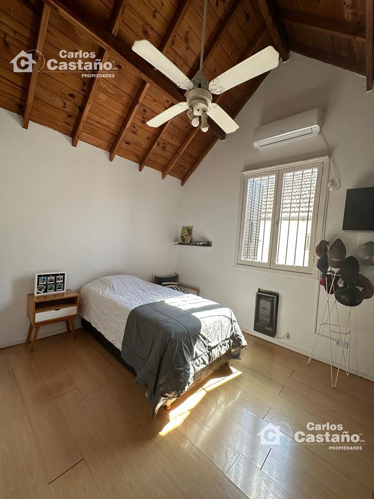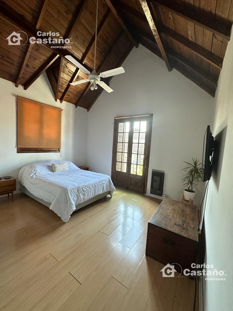 En planta alta: La Casa tiene 3 cómodos cuartos (con buenos placares), Suite al frente de 3,89×3,4m con Balcón, 2º Dorm. de 3,13×2,7m y 3º Dorm. de 4,07×3,19m + Baño compartimentado. Los cuartos tienen doble altura (techos de madera), ventiladores de techo, aires frio/calor; estufas de tiro balanceado, finas carpinterías de cedro, pisos de Mosaicos y pisos de Pinotea.