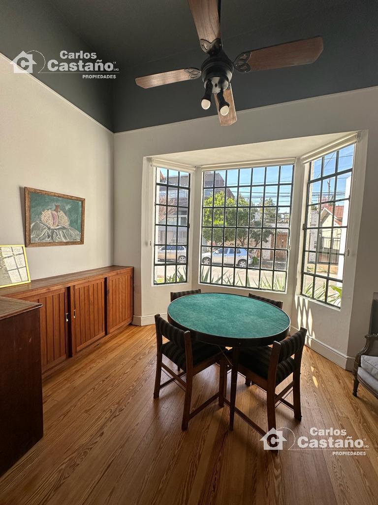 Porch; Hall de entrada de 2x1m; Living de 8,2×3,82m (piso de Pinotea); Escritorio de 3,82×2,15m (Bo-window); Comedor de 5,25x4m (piso Mosaico); Toilette de recepción; Cocina de 5,1×2,31m, muebles completos (de madera); Dependencia de Servicio de 3x3m con Baño de Servicio (podría ser un 4º cuarto en planta baja con vista al fondo; Garaje cubierto de 5,5×2,83m; Fondo libre de 12×8,66m con Parrilla + Piscina con filtro.