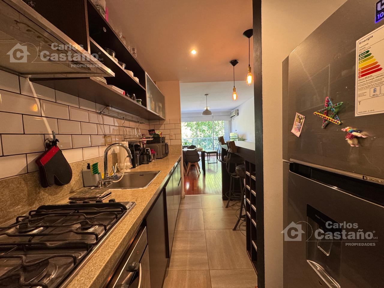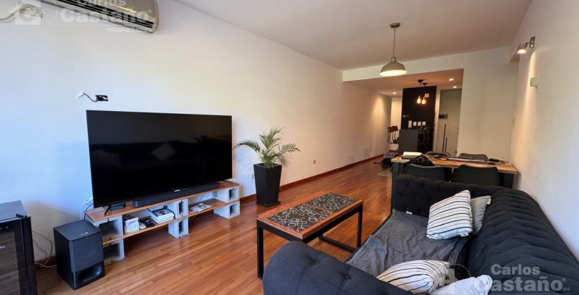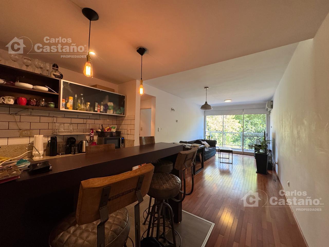 La propiedad cuenta con Hall de distribución; amplio Living-Comedor de 9x3m sobre pisos de madera y vistas al contrafrente; Balcón en «L» de 7x6x3m; Cocina americana de 4x2m integrada con barra y espacio para lavarropas; Lavadero; 2 amplios Dormitorios de 3,5×3,5m (1 en Suite con vestidor); Baño; Toilette completo; Cochera fija con Baulera.