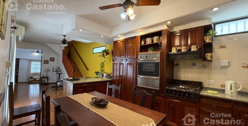 Living-Comedor de 4x3m con arcada a la gran Cocina/Comedor Diario de 8,6×3,04m con anafe + horno empotrado, muebles completos de alacenas y bajo mesada, en madera lustrada (tiene un desayunador y gran ventanal al Patio de 4,74x4m con parrilla); tiene 3 cómodos cuartos en PB de 3x3m con placares; Baño completo.