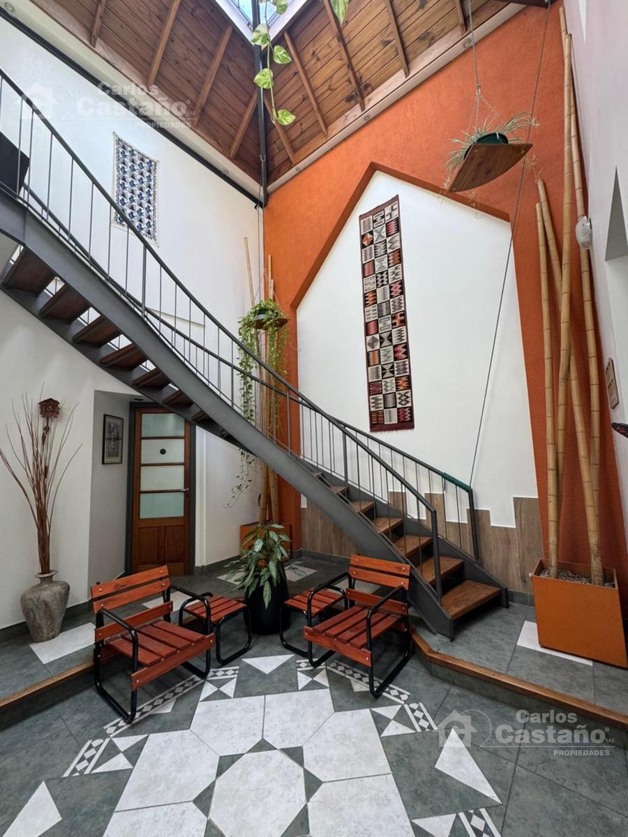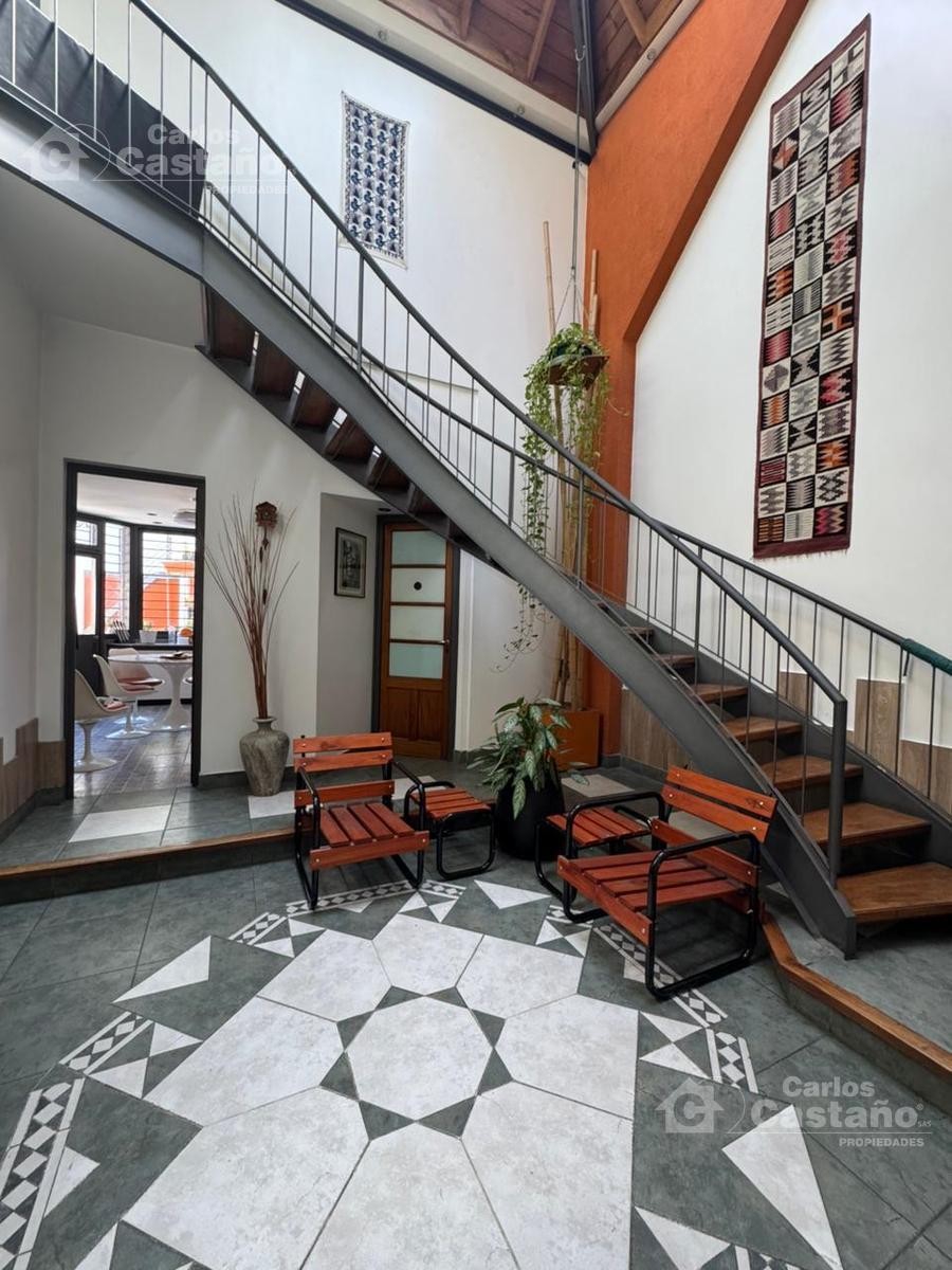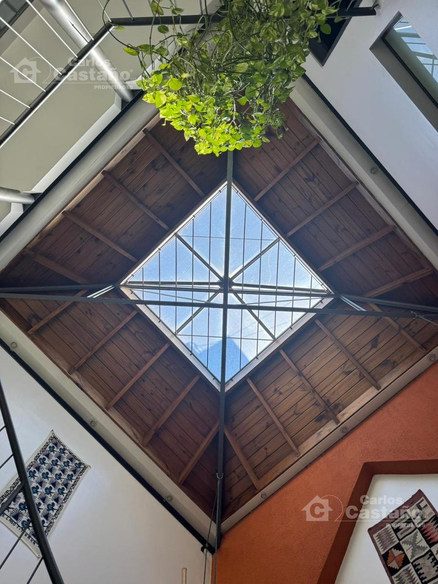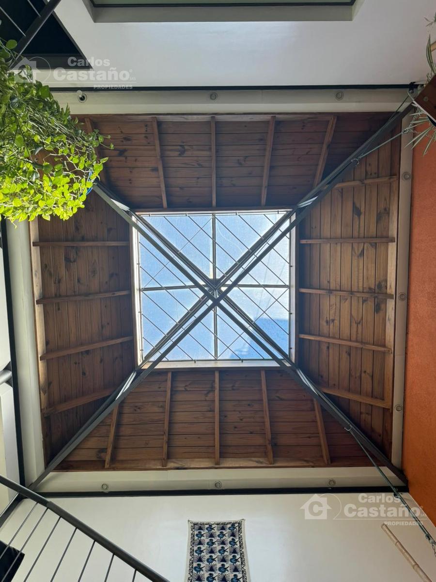 Hall doble altura de 4,5×4,5 con claraboya donde sale la escalera a la planta alta.